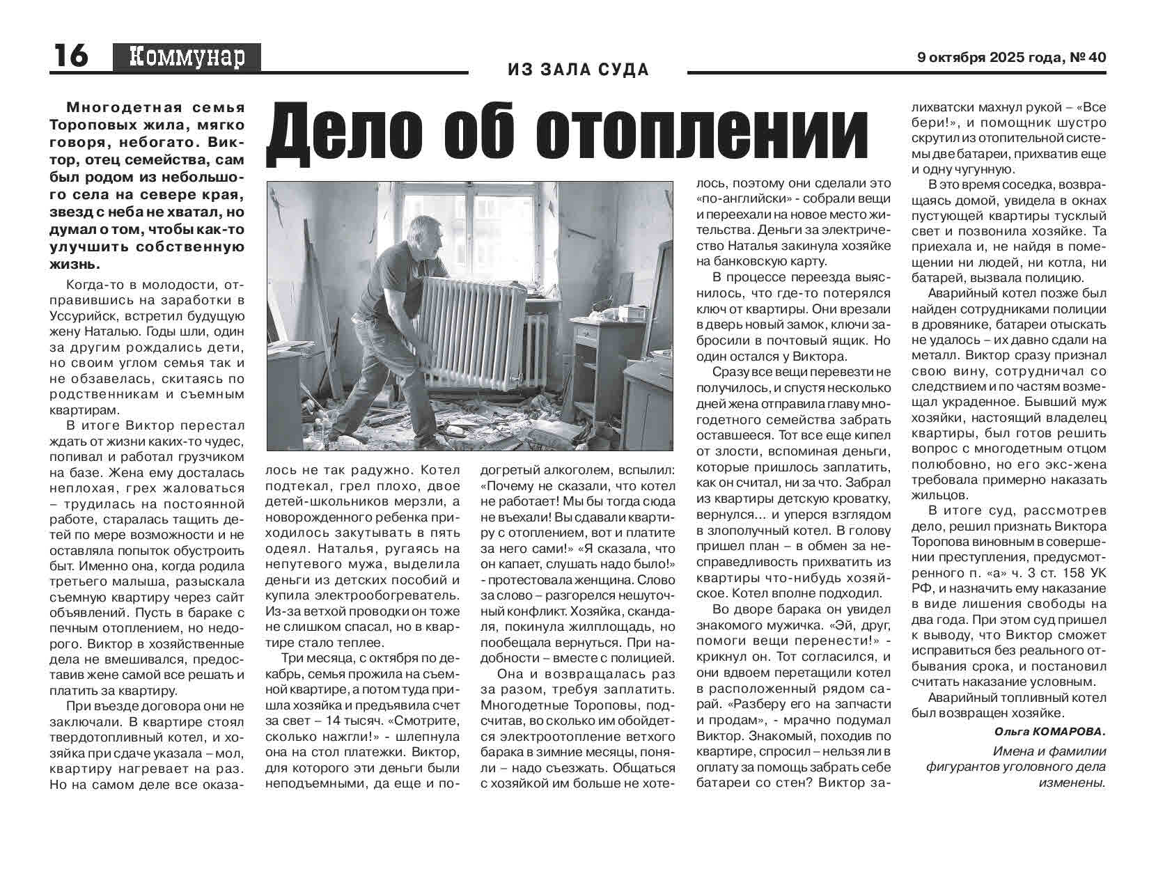 Дело об отоплении Многодетная семья Тороповых жила, мягко говоря, небогато. Виктор, отец семейства, сам был родом из небольшого села на севере края, звезд с неба не хватал, но в принципе думал о том, чтобы как-то улучшить собственную жизнь. Когда-то в молодости отправившись на заработки в Уссурийск, встретил здесь будущую жену Наталью. Годы шли, один за другим рождались дети, но своим углом семья так и не обзавелась, скитаясь по родственникам и съемным квартирам. В итоге Виктор перестал ждать от жизни каких-то чудес, попивал и работал грузчиком на базе. Жена ему досталась неплохая, грех жаловаться – трудилась на постоянной работе, старалась тащить детей по мере возможности и не оставляла попыток обустроить быт. Именно она, когда родила третьего малыша, разыскала съемную квартиру через сайт объявлений. Пусть в бараке, с печным отоплением, но недорого. Виктор в эти хозяйственные дела не вмешивался, предоставив жене самой решать дела и платить за квартиру. При въезде договора они не заключали, договорились с на словах. В квартире стоял котел для твердого топлива, и хозяйка при сдаче указала – мол, квартиру нагревает на раз. Но на самом деле все оказалось не так радужно. Котел подтекал, грел плохо, двое детей-школьников мерзли, а новорожденного ребенка приходилось закутывать в пять одеял. Наталья, ругаясь на непутевого мужа, выделила деньги с детских пособий и купила электрообогреватель. Из-за ветхой проводки он тоже не слишком спасал, но в квартире стало теплее. Три месяца, с октября по декабрь, семья прожила на съемной квартире, а потом туда пришла хозяйка и предъявила счет за свет – 14 тысяч. «Смотрите, сколько нажгли!» - шлепнула она о стол платежками. Виктор, для которого эти деньги были неподъемными, да еще и подогретый алкоголем, вспылил: «Почему не сказали, что котел не работает! Мы бы тогда сюда не въехали! Вы сдавали квартиру с отоплением, вот и платите за него сами!» «Я сказала, что он капает, слушать надо было!» - протестовала женщина. Слово за слово – разгорелся нешуточный конфликт. Хозяйка, скандаля, покинула жилплощадь, но пообещала вернуться. При надобности – вместе с полицией. Она и возвращалась, раз за разом, требуя заплатить. Многодетные Тороповы, подсчитав, во сколько им обойдется электроотопление ветхого барака в зимние месяцы, поняли – надо съезжать. Общаться с хозяйкой им больше не хотелось, поэтому они сделали это «по-английски» - собрали вещи и переехали на новое место жительства. Деньги за электричество Наталья закинула хозяйке на банковскую карту. В процессе переезда выяснилось, что где-то потерялся ключ от квартиры. Они врезали в дверь новый замок, ключи забросили в почтовый ящик. Но один из них остался у Виктора. Сразу все вещи перевезти не получилось, и спустя несколько дней жена отправила главу многодетного семейства забрать оставшееся. Тот все еще кипел от злости, вспоминая деньги, которые пришлось заплатить, как он считал, ни за что. Забрал из квартиры детскую кроватку, вернулся… и уперся взглядом в злополучный твердотопливный котел. В голову пришел план – в обмен за несправедливость прихватить из квартиры что-нибудь хозяйское. Котел вполне подходил. Во дворе барака он увидел знакомого мужичка. «Эй, друг, помоги вещи перенести!» - крикнул он. Мужичок согласился, и они вдвоем перетащили котел в расположенный рядом 